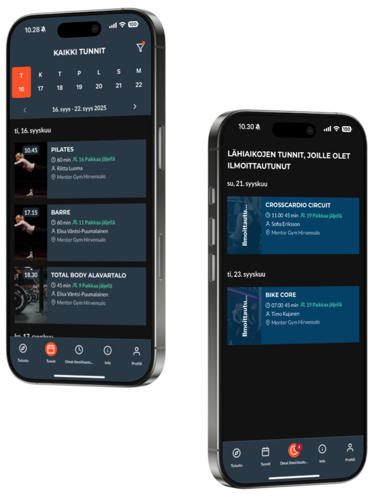 Mentorin tuntikalenteri löytyy kätevimmin Go Active -sovelluksesta. Sovelluksessa voi selailla ajantasaisia tuntikuvauksia ja aikatauluja, varata sekä perua varauksia helposti muutamalla painalluksella.